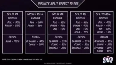 当你获得卡牌与变体后,就可以用蓝点和粒子对其进行升级;升级到无限等级后,该卡牌就能进行一次分裂操作。分裂会为卡牌新增背景特效和粒子特效——背景特效包含闪箔、棱镜、墨色、炫金四类;粒子特效则分为格调、微光、星尘、爆裂四种,且每种粒子特效还对应黑、彩虹、金、紫、红、蓝、白、绿这些颜色。关于各类背景特效与粒子特效的分裂概率,具体如下: