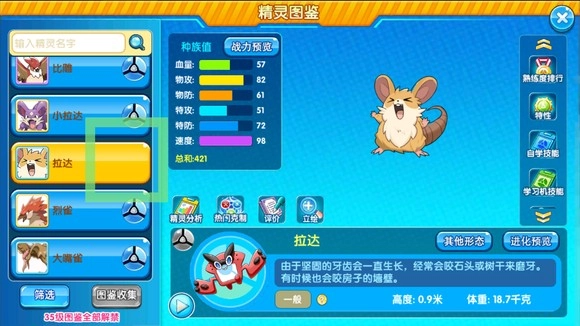 收集精灵时可以善用【地图捕获】【金币扭蛋机】【沙湖乐园】【精灵花园】【奇迹交换】等途径,此外还需要大量进化石用于精灵进化,同时得具备一定的仓库精灵筛选整理能力和图鉴运用能力——比如下图里拉达右侧没有精灵球标识,就说明还没捕获过这只精灵,去收集它绝对不会和仓库里已有的宠物重复。