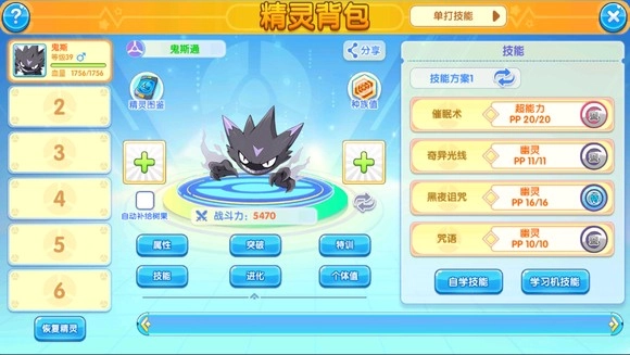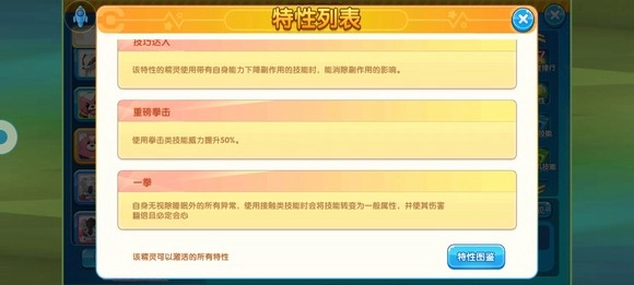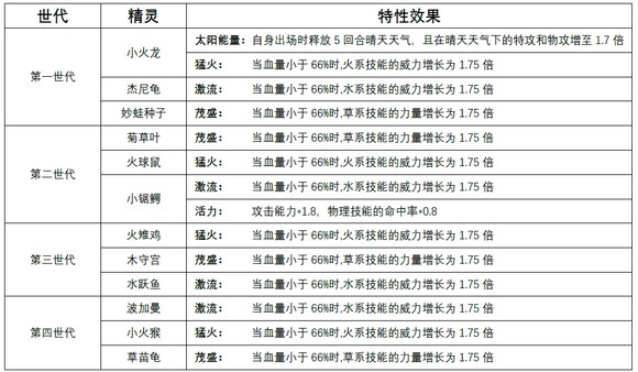 进入游戏初始界面,你会看到游戏提供了四个世代的精灵。需要留意的是,部分精灵具备强化特性,这类特性通常能在推图过程中带来额外助力。以下是精灵(含其70级前的进化形态)与对应强化特性的表格: