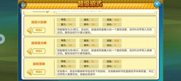 超级火焰拳属于高威力的双属性攻击技能,即便它的属性变为一般系,技能特效却不会改变,依然能够实现克制效果,并且存在50%的概率附加灼烧状态。