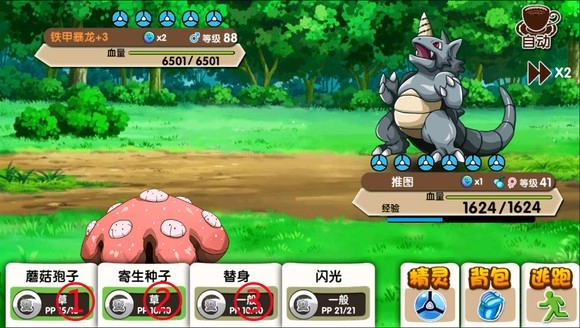 按顺序点击【蘑菇孢子】【寄生种子】【替身】,此时对方精灵或许会苏醒或许继续沉睡。要是对方还在睡眠,就用【闪光】降低其命中率来提高容错率;要是对方醒了,可以用【蘑菇孢子】或【替身】接着消耗血量。需要注意的是,当对方精灵血量见底时,一定要持续点击替身,确保对方下一只精灵出场时,派拉斯处于替身状态,之后再沿用上述方法推进关卡。