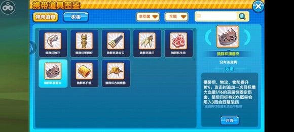 另外要提的是狼群杯捕兽夹,携带这件道具后,宝可梦的物理攻击和物理防御会提升10%,攻击时还会追加一次相当于目标最大生命值1/16的恶属性固定伤害,之后目标有20%的概率陷入持续3回合的回复阻挡状态。它用来应对一些带有被动回血能力的宝可梦时,也具备不错的消耗效果,比如面对召唤火这类宝可梦,只要能让对方陷入回复阻挡,就能占据压制性的输出优势。而且追加的伤害本身属于固定伤害类型,搭配宝可梦自身的特性与技能使用,不少肉盾型宝可梦都难以承受这样的伤害压力。凭借着高额的基础输出和稳定的固定伤害加成,狼群杯捕兽夹确实是一件相当实用的道具。