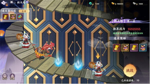 在游戏里,玩家要挑战的是朝天塔的主塔,以及妖邪被击败后出现的副塔,这就要求玩家持续提升自身实力,去挑战塔中的怪物。之后出现的金木水火土五座副塔,会和对应的系别伙伴相匹配,要是使用同系别的妖灵伙伴参与挑战,就能获得一定的加成效果,所以玩家得合理搭配伙伴阵容来完成挑战。