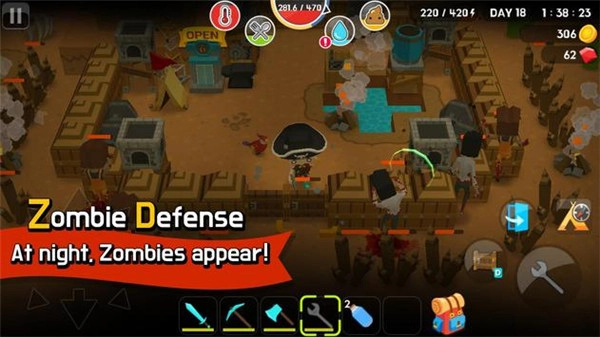 夜幕降临之际,僵尸会前来攻击我们的基地,因此必须拿起武器进行战斗,守护好自己的基地建筑。