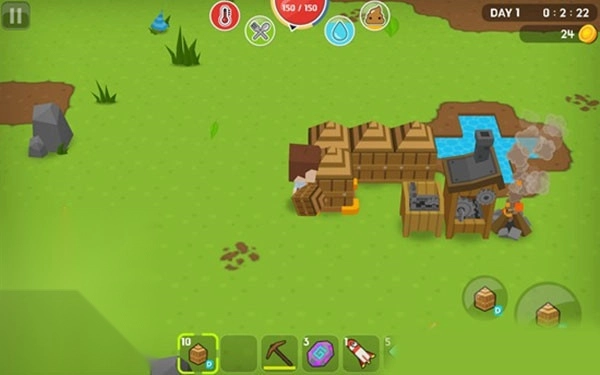 找一处临近水塘的位置,安置营火和工作台。工作台摆放妥当后,“攻击”按钮的上方会显示出工作台的图标,点击该图标就能打开工作台了。