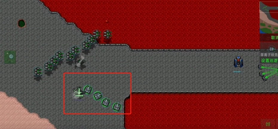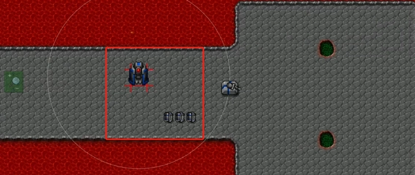 关于第一个要解决的抢速问题,就是如何让3号建造者以最快速度登场。大家应该都了解铁锈战争的机制——游戏里每个单位在刚生产出来的瞬间,是具备穿墙能力的。我们可以利用这个特性:让建造者先向后穿墙移动一小段距离,接着马上调整方向回正,等它方向回正后,再让它继续向前行进就可以了。
