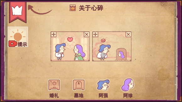 先把婚礼拖进左边的框里,接着将阿强和阿珍也拖入左边框完成结婚仪式,之后把墓地拖到右边的框中,再把阿强拖到右边框的坟地旁边,最后把阿珍拖进坟地里,就能顺利通关了。这段操作对应的故事是:阿强和阿珍携手步入婚礼殿堂,几年后阿珍离世,阿强因此心碎不已。
