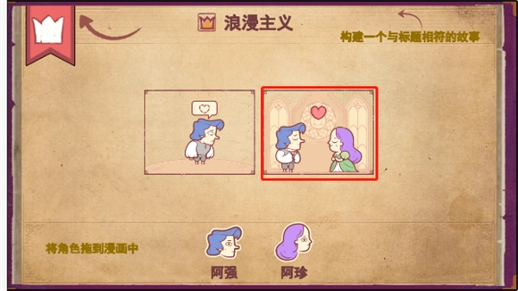 要构建出契合“初恋”主题的剧情其实很简单:先把阿强拖进第一个框里,接着把阿强和阿珍一起拖入第二个标着“婚礼殿堂”的框中,如此一来,他们就以彼此初恋的身份相爱并步入婚姻了。