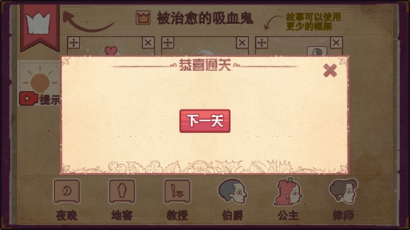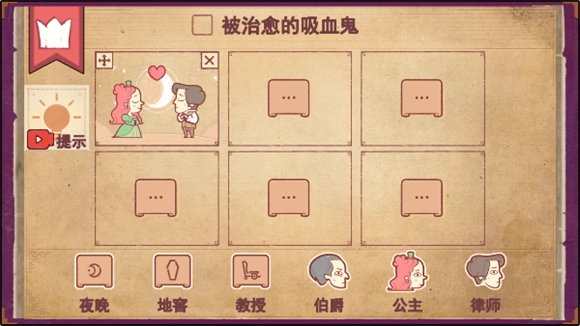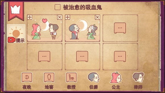 第五步将夜晚拖入第五个框内,接着把律师拖进去,再把公主也拖进去,如此一来,吸血鬼公主就被治愈了!