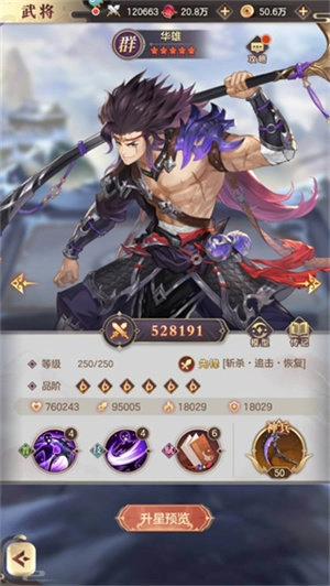 这套阵容的群体伤害输出和各类状态效果都很充足,能为华雄的斩杀创造有利条件。而且在激活八星天赋后,若我方有武将阵亡,华雄就能再次释放怒气大招,专门针对敌方处于控制或异常状态的目标造成伤害。袁绍的怒气技能“名震天下”可直接攻击敌方全体武将,并且剩余的敌方目标越少,该技能的伤害就越高,因此使用袁绍时完全不用担心群体伤害技能会出现溢出的情况。