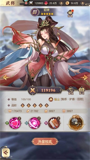 在这套阵容里,貂蝉是绝对的核心角色。她的普攻自带护盾效果,这让身为谋士的她完全可以顶在队伍前排。她的技能“万花缭乱”会攻击敌方前排,还有概率触发魅惑状态——这个效果专门针对男性武将,一旦生效,目标本回合不仅无法行动,貂蝉还能借此回复自身血量。当貂蝉达到八星解锁天赋后,无论是普攻还是技能都能削减目标的怒气;而到了十星天赋阶段,她还能实现自我怒气回复。