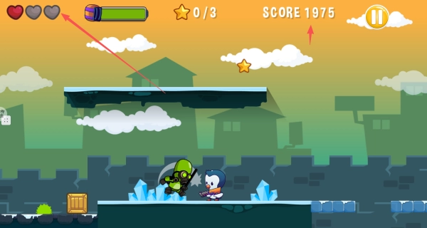 进入游戏后,先熟悉操控逻辑:左侧按钮负责控制企鹅左右移动,右侧的两个按钮则分别对应跳跃和攻击功能。