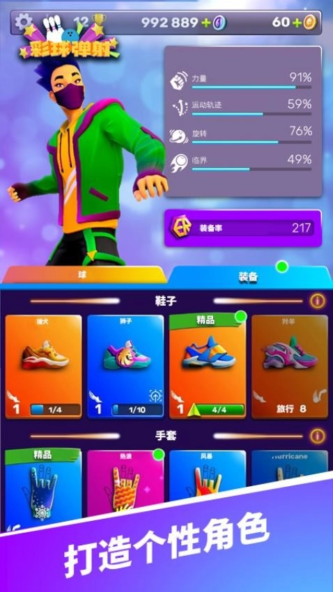 提升保龄球的“旋转效能”“力度”“轨迹”等属性,升级并解锁个性装备——从酷炫球袋到定制手套,打造独一无二的保龄巨星。