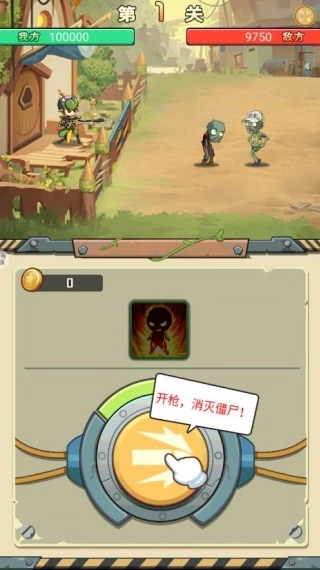 2、长按下方的大圆形按钮就能启动射击功能,当面对源源不断入侵的僵尸时,玩家得进行疯狂操作,把它们都消灭掉才能获取胜利。