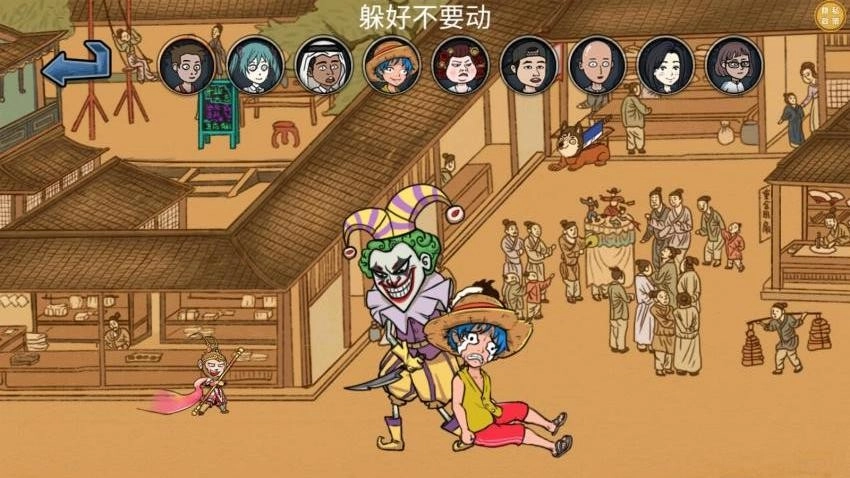 如图所示,游戏开始后,玩家将在古画场景中进行躲避,而小丑角色需要找出所有隐藏的玩家才能通关,整个游戏可在二维场景中进行。