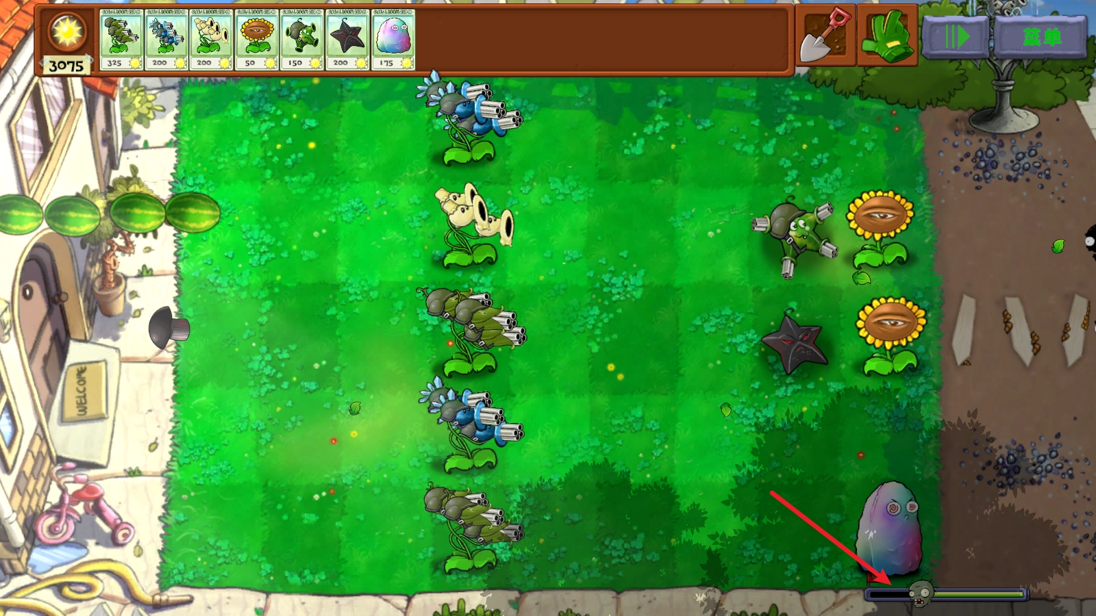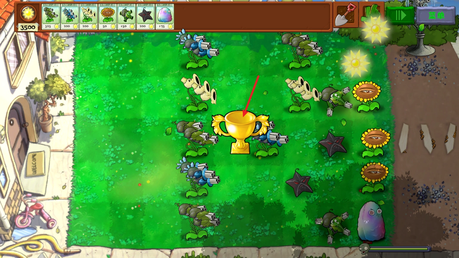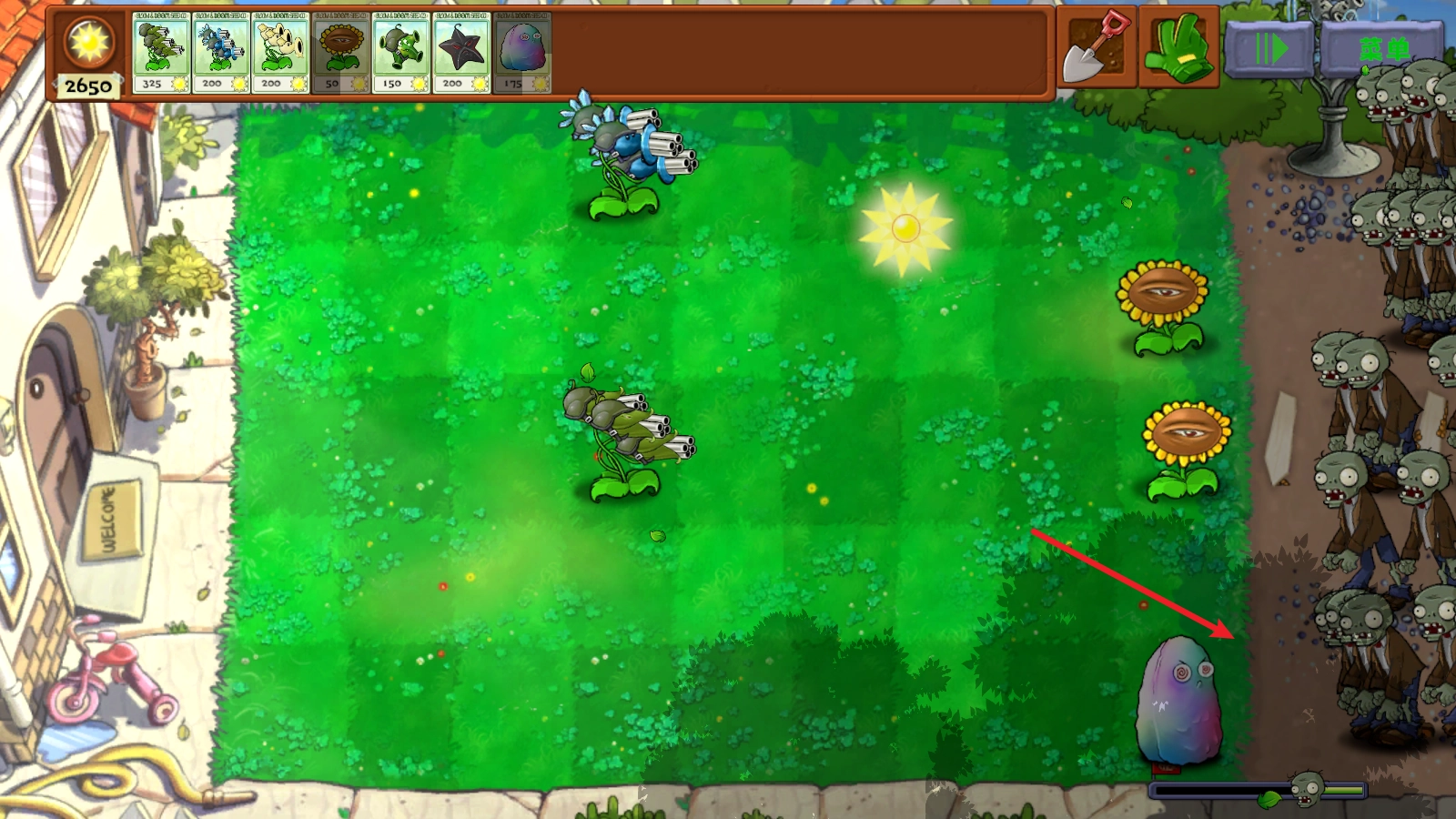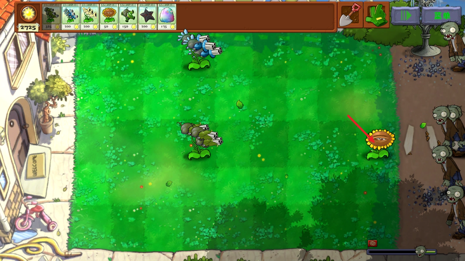 3、还有会魅惑僵尸的高坚果,一起放在第一排。