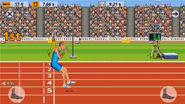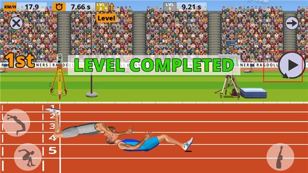 2、按照游戏里的障碍物分布或运动的时机,有节奏地进行按键操作,同时在物理引擎的作用下把控好方向。游戏里主要是操控运动员的两条腿,每条腿都对应着一个按钮。