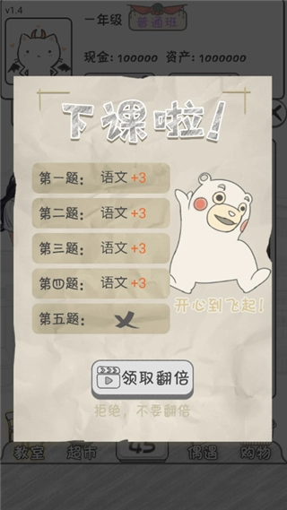 5、持续通过答题学习,保证语文、数学、英语三门课程的得分都不低于60分,同时把日历天数的计数点到0的时候,就能成功升级了。这就好比一个学期结束,而且期末考试也通过了哦!是不是挺有意思的呀?