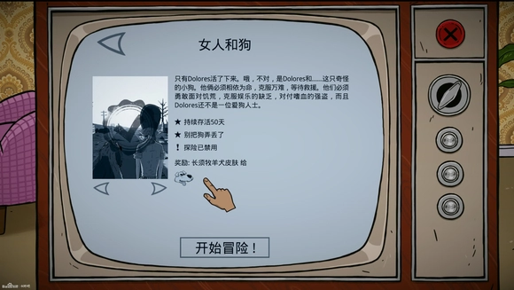1、【女人和狗】、玩法重点、优先给狗留整个罐头;尽量多积累罐头,保留防身武器(斧头,挂锁,杀虫剂,口琴,步枪),避免发疯。