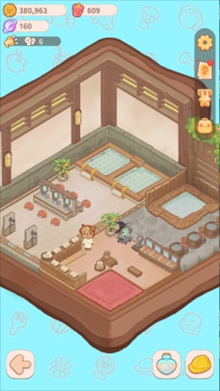 温泉区域配备了淋浴、温泉池、洗漱台、毛巾柜等日常设施。部分设施设有耐久值机制,客人使用互动后耐久值会相应减少,玩家可通过点击操作进行补充。