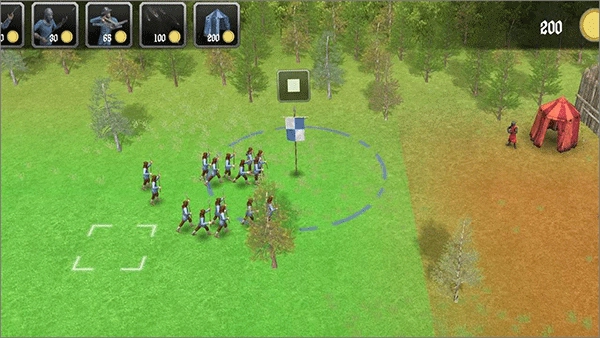 当我方单位踏入旗帜所在的圆形区域时,该旗帜会自动切换为我方阵营标识;点击界面上方的启动按钮后,我方单位将离开该圆形区域并向敌方发起攻击。