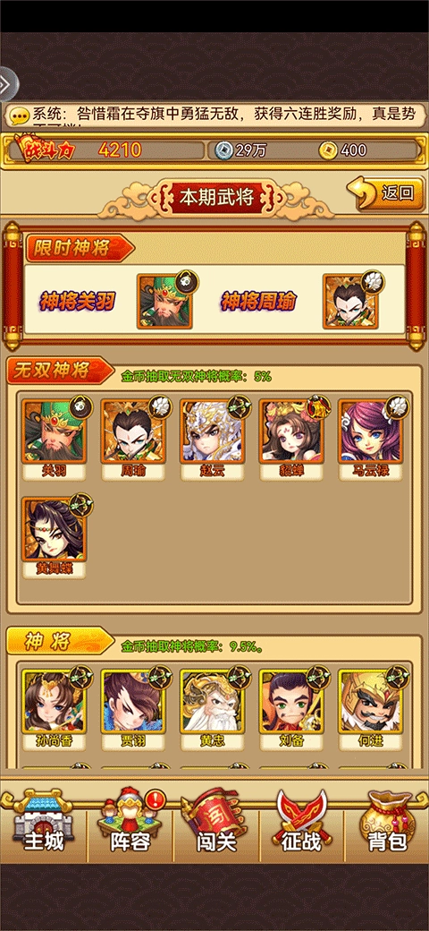 先抽一次战将,接着再去抽良将或神将;要是没抽中,就继续抽战将。按照这样的方式循环抽取,抽到优质武将的概率也会有所提升。