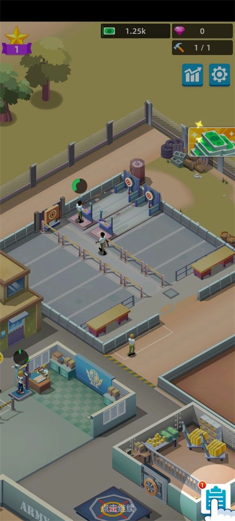 多样场地静待你来开启!射击练习、障碍挑战、室内靶场射击、街巷作战、拳击对决、轰炸演练等应有尽有。您只需点击操作并完成升级,用赚取的现金投入基地建设与升级,解锁各类训练设施,提升声望等级,不断壮大军队规模,最终打造一个强大的军事商业帝国!