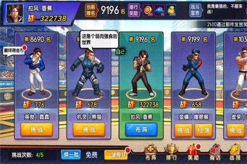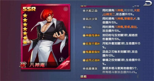 除了搭配的选择,之前我们也提到过,格斗家配置是2×3的格子,以上面图示的配置为例:八神和K是主力输出,娜可露露负责收割;草稚京的伤害减免效果能有效保护八神,再加上八神自身的吸血能力,可实现持续输出;而拥有极限格挡与不死之躯称号的拉尔夫,尽管输出不高,但凭借极厚的血量在前排扛伤,能为后排减轻压力。