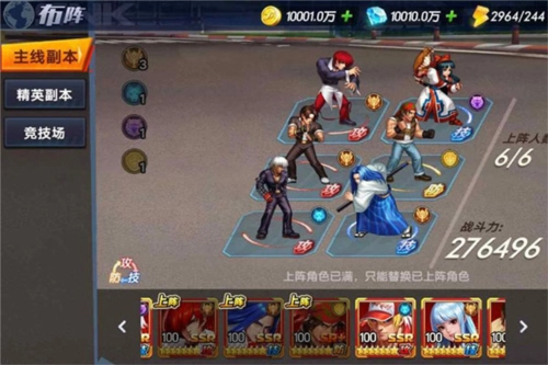 在《拳魂觉醒》这一部里,登场的依旧是拳皇系列的角色,但战斗模式有所调整——采用6V6的回合制玩法。玩家可配置六个角色位置,从一号位到六号位,其中前排为1、2、3号位,后排是4、5、6号位(按竖排划分)。关于阵容搭配的建议是:前排适合安排输出型或控制型角色,后排则选用输出能力较弱的角色以及各类辅助角色,而坦克角色推荐放在3号或5号位置,以便承担主要伤害。