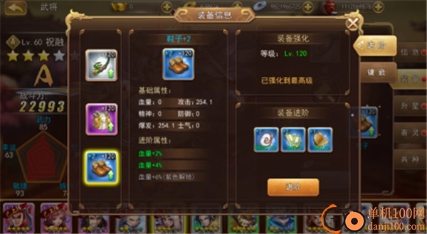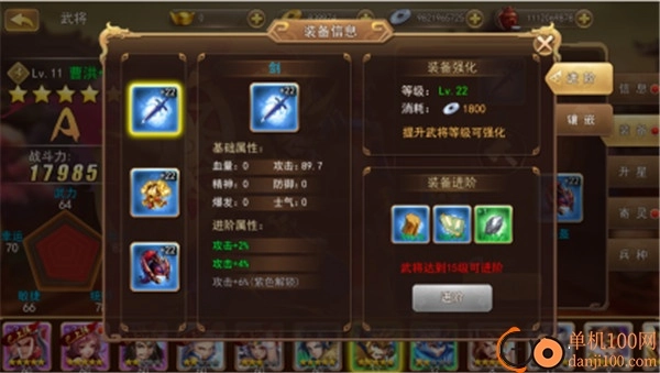 主公可消耗银币强化武将装备,强化后装备属性会提升,不过装备的强化等级不能高于该武将等级的两倍。