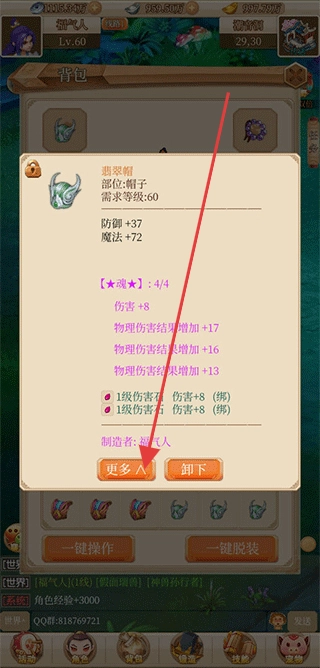 3、打开【背包】,为角色装备“悲翠帽”这类60级装备,可借助“一键操作”功能实现快速穿戴,同时要根据装备词条(物理伤害结果)来匹配适配的角色。