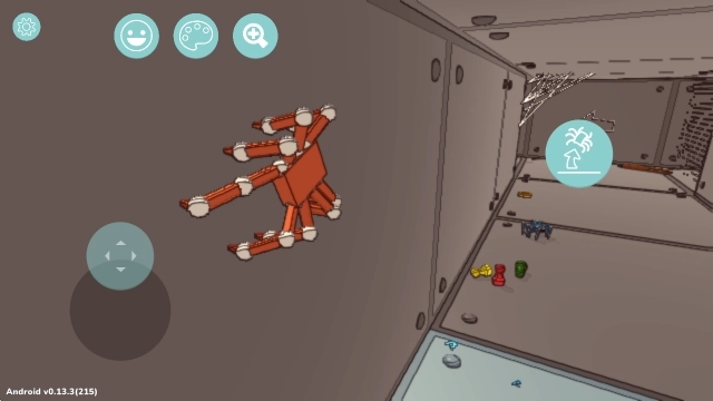 1、进入游戏后,拖动左侧摇杆操控蜘蛛移动,靠近角色后点击右下角按钮就能完成互动。