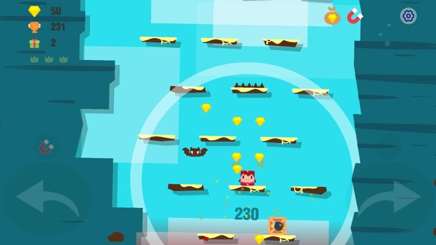 在跳跃的时候,您将捡到不同的道具,例如火箭,炸弹等。合理的使用道具,将带来完全不一样的体验。