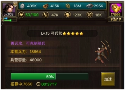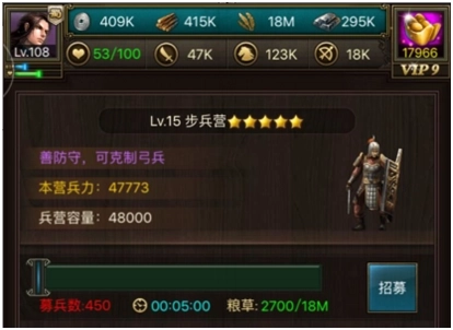 兵营可以让你士兵的容量增加,在打战时才不会因为没士兵还要等着招募时间而错失上场的机会,右下角的募兵加时是很重要的,如果你不是土豪玩家开一堆队列,建议你最少买到50分钟,不过队列也建议多开1-2行(200元宝、400元宝)是会省下很多时间的。