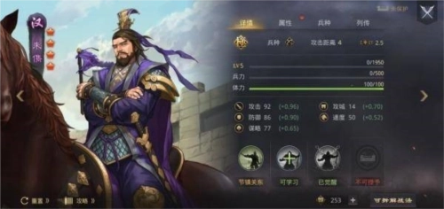 第二步,把祝融升到五级并开启战法后,安排她进行征兵操作,要注意的是不要动用预备兵;接着让朱儁带领另一名武将去攻打高级地来获取经验升级,所以这里需要准备两张朱儁。另外需要留意的一点是,负责开荒的这两个武将,他们的体力数值必须保持一致。