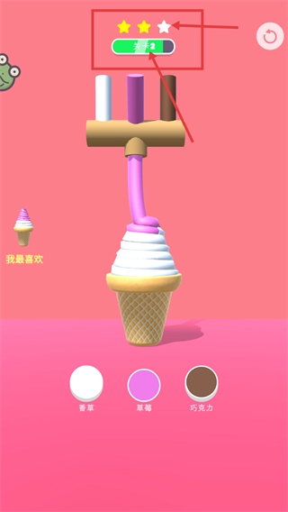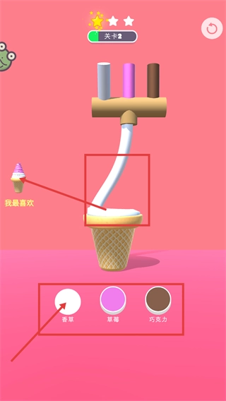 1、在【关卡2】里,先确认要制作的目标冰淇淋是【我最喜欢-香草-草莓-混合款】,之后就可以通过下方的【香草】【草莓】【巧克力】按钮来挑选对应的原料进行制作。