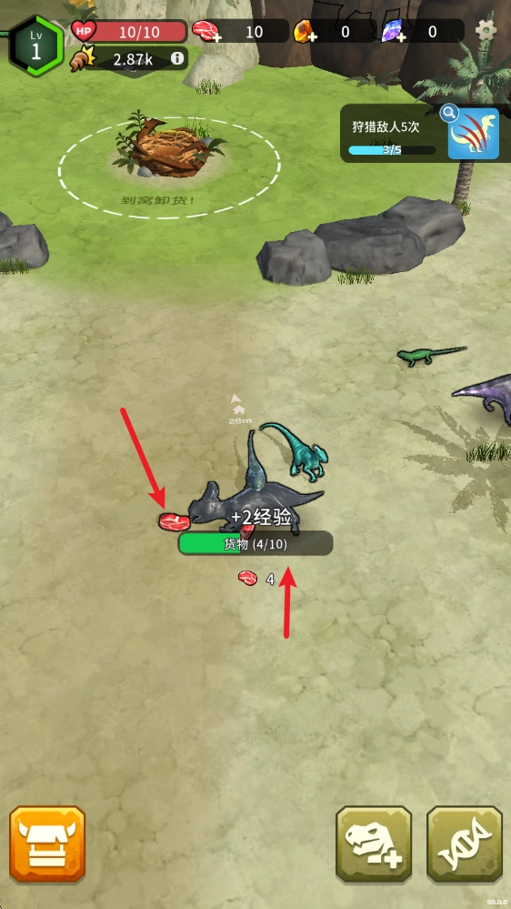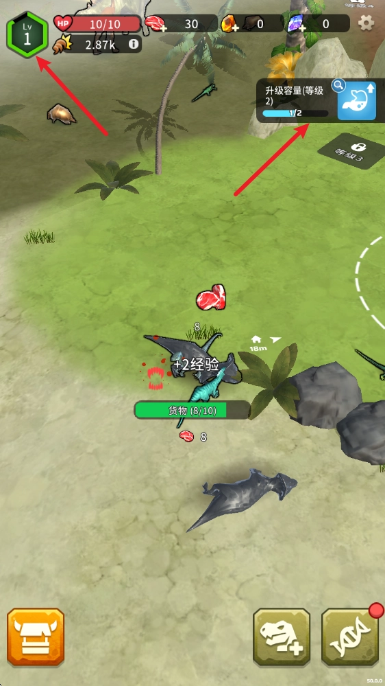 猎杀猎物后会掉落食物,靠近就能拾取,下方还会显示你的容量。