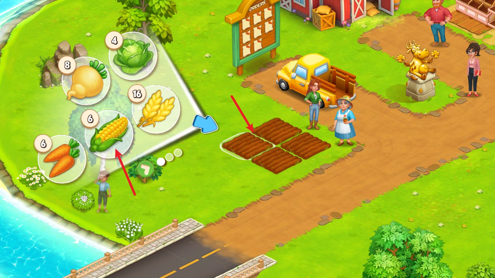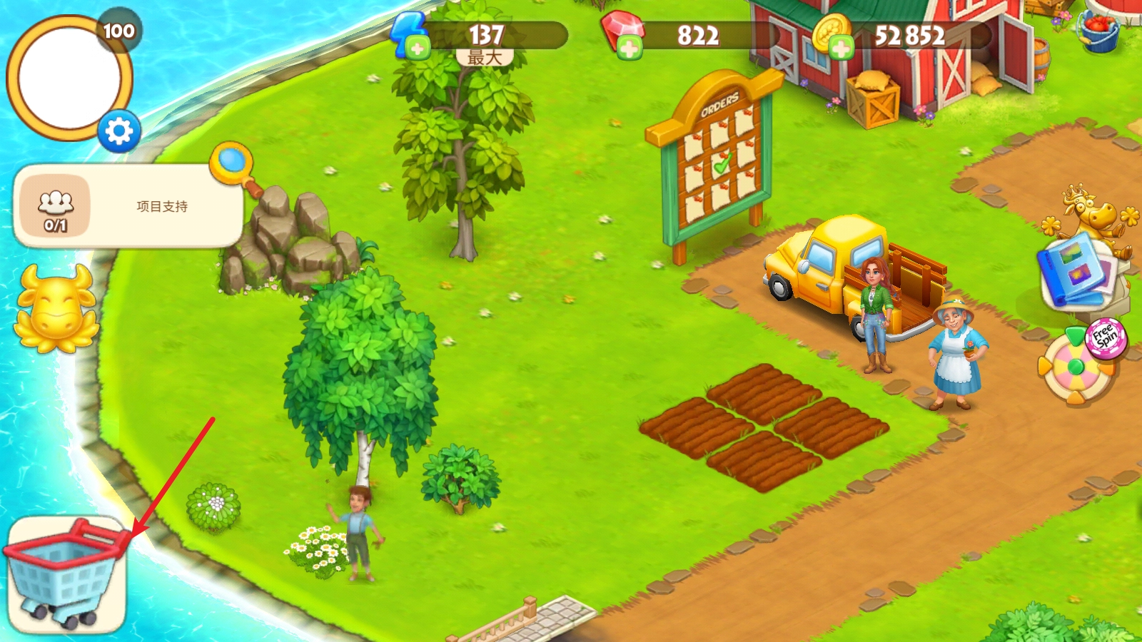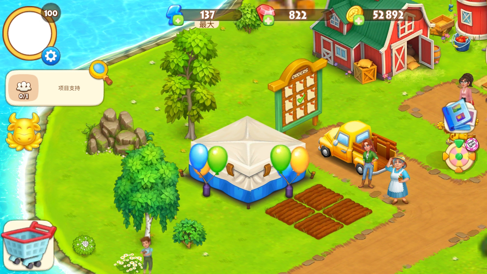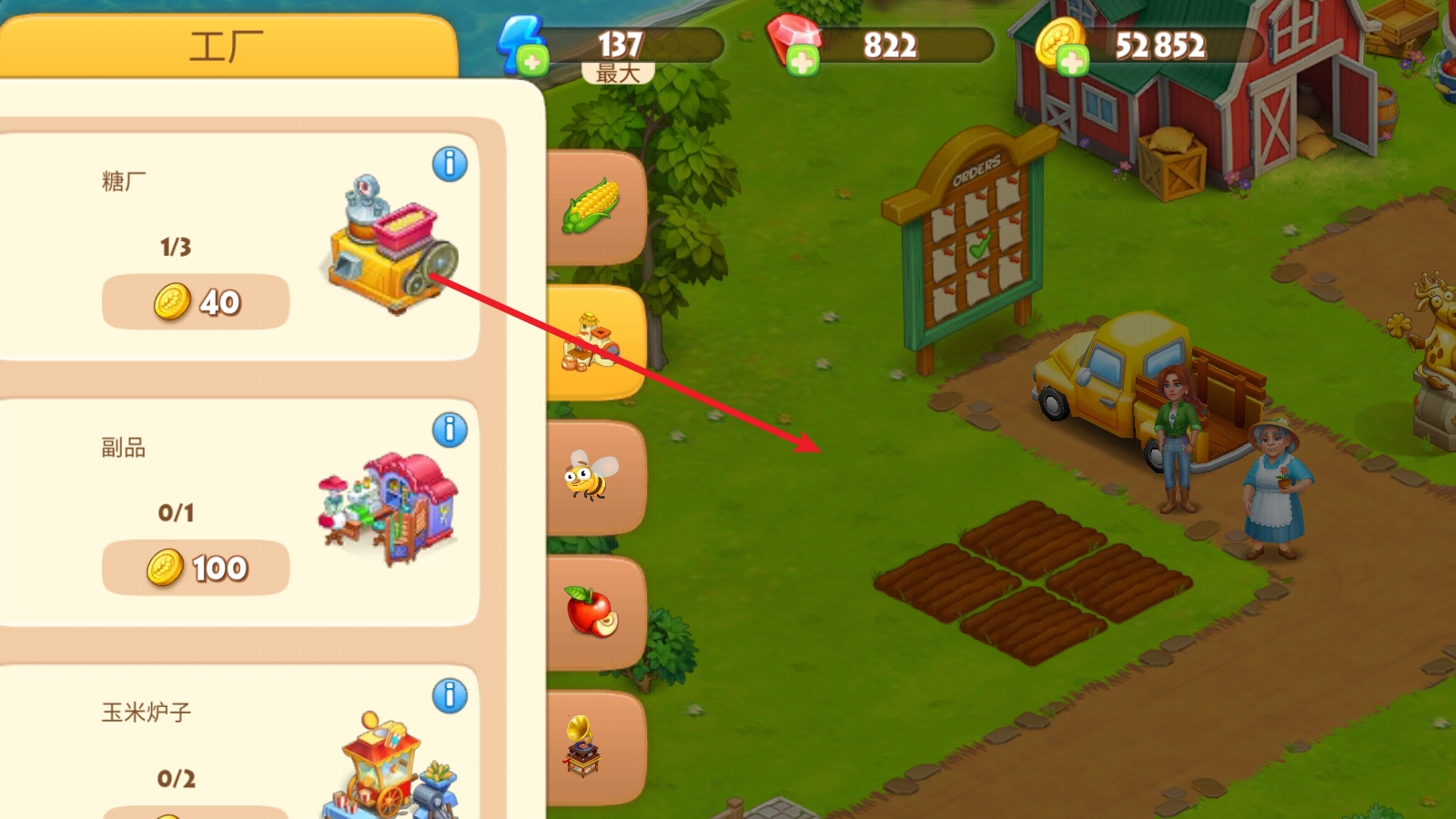 首先我们来尝试种植农作物,点击空地后,选择合适的种子,拖动即可种满田地。