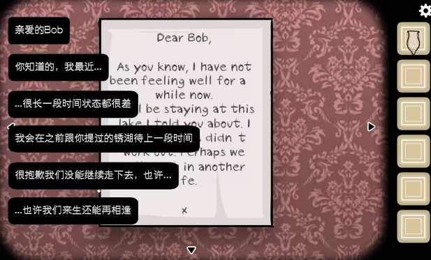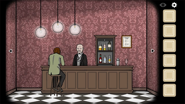从柜台视角来看:酒保乌鸦先生吩咐我们给坐在柜台旁的鲍勃递上一杯酒。首先点击柜台上的调酒器,参照墙上的配方,依次点击伏特加和橙汁各两次,接着点击调酒器两次,便能调出一杯螺丝起子鸡尾酒,还能解锁“螺丝刀”成就。把这杯酒递给鲍勃,等他喝下后,会从嘴里吐出一把螺丝刀;之后取回鲍勃手中的鸡尾酒杯,依据《生日》里从祖父上衣口袋找到的配方,分别点击杜松子酒和汤尼水各两次,再点击调酒器两次,就能调出一杯琴汤尼,同时获得“锈湖琴汤尼”成就,最后将这杯酒递给鲍勃饮用。