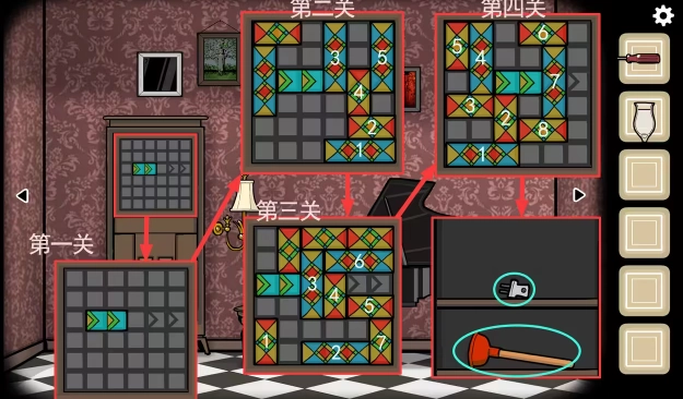 从钢琴的视角来看:点击柜子上方格子区域的游戏,我们需要把天蓝双格长条向右移动到带有标记的位置。