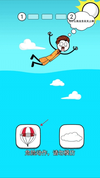 2、这款游戏的核心玩法十分简单易懂,玩家要挑选合适的道具来帮助火柴人脱离困境。选择不同的道具,会带来截然不同的结局。比如在某个场景里,要是选择左边的降落伞,就能把阻挡前进的云朵驱散掉。