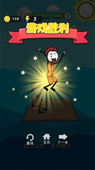 1、帮助火柴人开启惊险的逃亡之路,不管遇到多少危险,都得想尽办法帮他转危为安;