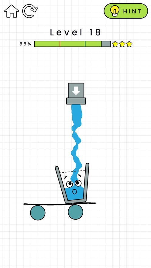1、采用趣味卡通的画风,操作方式简洁,通过一笔画线的方式引导水流顺利注入水杯。